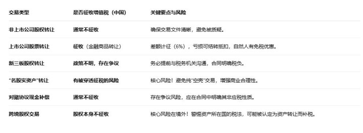 不同股权交易场景下的增值税处理规则,并提示关键风险点和防范建议。